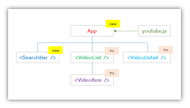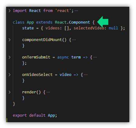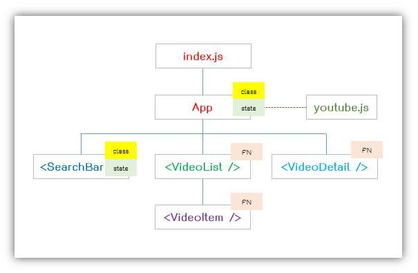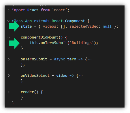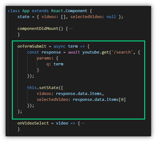 ในไฟล์ App เรามี state ที่ใช้เก็บ videos คือวีดีโอผลลัพธ์ 5 รายการ และ selectedVideo คือวีดีโอที่ถูกเลือกให้แสดงผลที่ส่วนของ VideoDetail