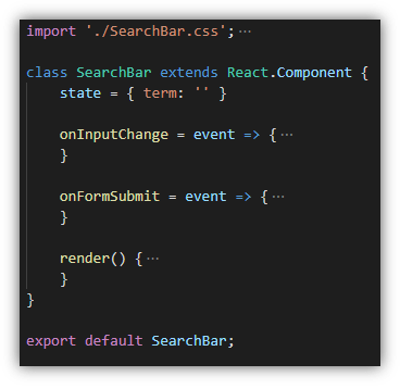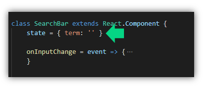 ในไฟล์ SearchBar.js เราเราเก็บ state เป็นคำค้นที่ผู้ใช้งานกรอกเข้ามา โดยมีชื่อว่า term มีค่าเริ่มต้นเป็น string ว่าง ๆ
