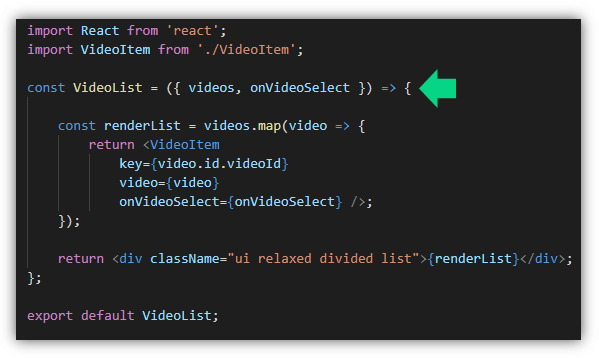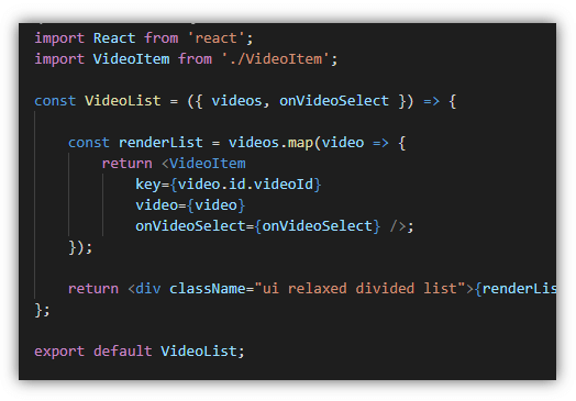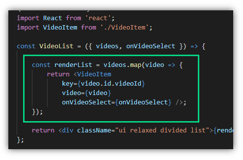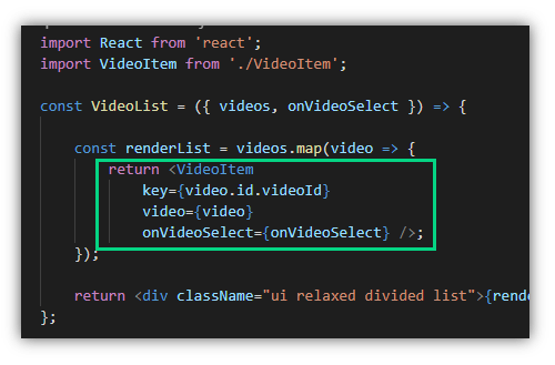 จากนั้นก็ส่งต่อ prop ไปให้ <VideoItem /> จำนวน props 3 properties คือ key, video, และ onVideoSelect