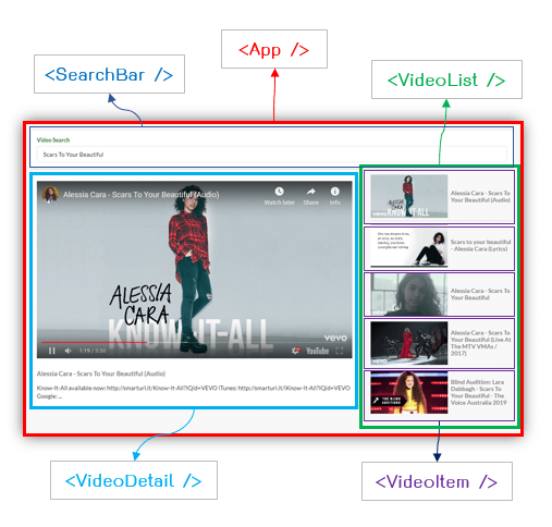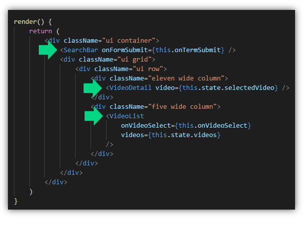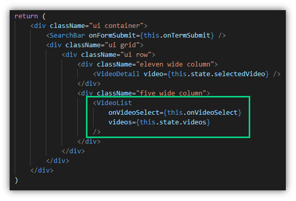 selectedVideos ได้ค่ามาจากการเรียกใช้งานเมธอด onVideoSelect การทำงานงานของมันคือ ทำการรับค่าวีดีโอที่ถูกคลิกเลือกเข้ามา และนำไป set ให้กับ state ในส่วนของ render() เราส่ง state เป็น porps ให้กับ <VideoList /> จำนวน 2 properties คือ onVideoSelect และ videos