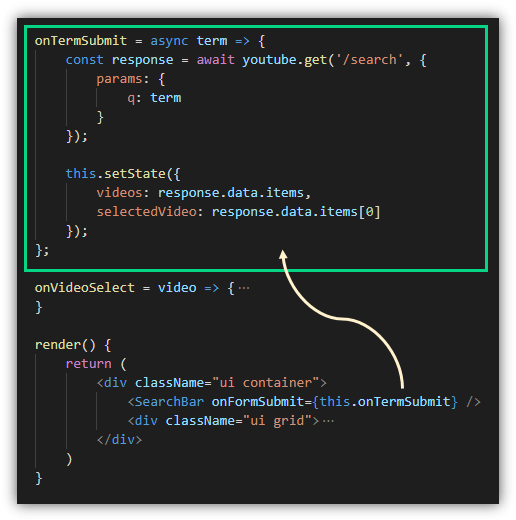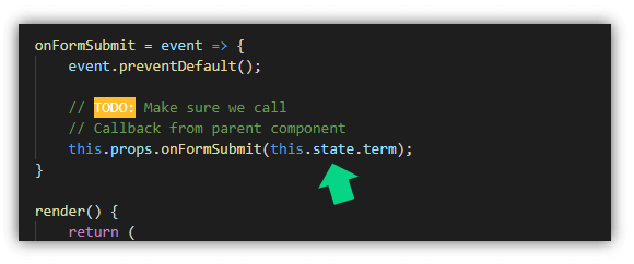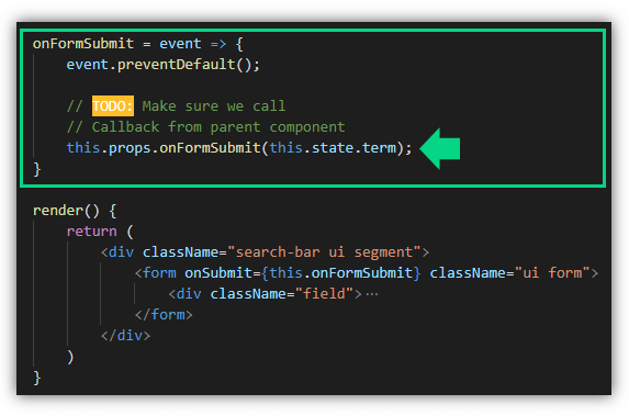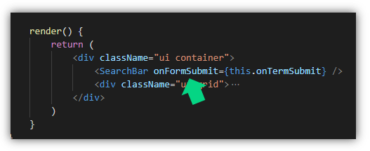การที่การเรากำหนดว่า onFormSubmit={this.onTermSubmit} หมายความว่าเมื่อ props ชื่อ onFormSubmit ถูกเรียกใช้งาน หมายถึง การเรียกใช้งานเมธอด onTermSubmit นั้นเอง