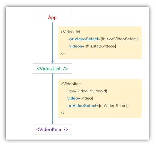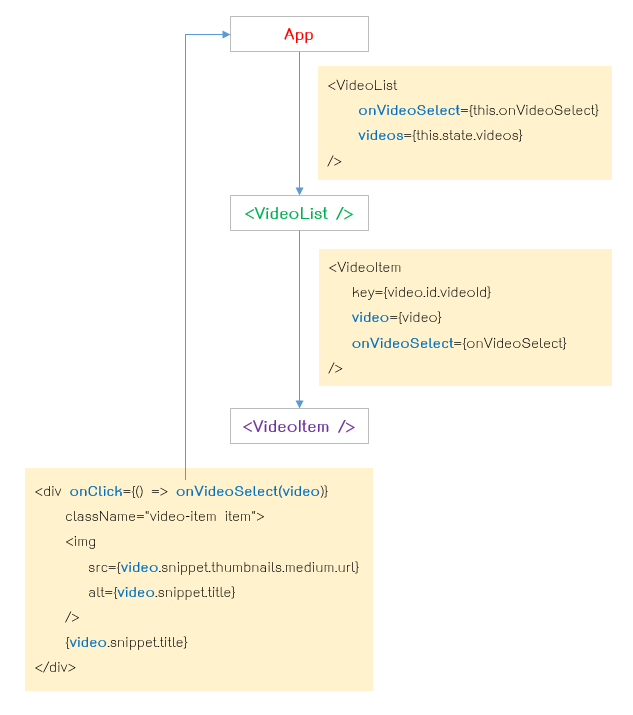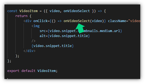 onVideoSelect ก็คือเมธอด onVideoSelect ใน App.js นั่นเอง เราส่งเมธอดนี้ไปใน <VideoList /> แต่ <VideoList /> ไม่ได้ใช้ มันเป็นแค่ทางผ่าน เพื่อส่ง props ต่อไปให้ <VideoItem /> เท่านั้น