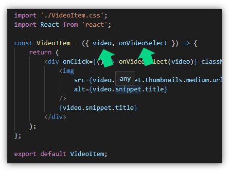มาที่ VideoItem.js เรารับค่า props มาจาก <VideoList /> จำนวน 2 properties คือ video และ onVideoSelect