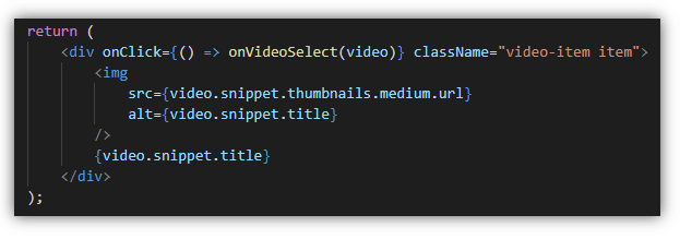 เราเรียกใช้ onVideoSelect ใน <div> ของข้อมูล เป็นแบบ onClick พร้อมกับส่งค่า video ไปให้เมธอดนำค่าไปใช้งานด้วย (กรณีเป็น function ไม่ต้องใช้ this)