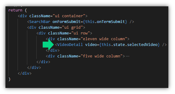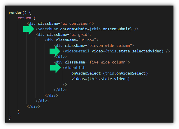 ในส่วนของเมธอด render เราใช้งาน <SearchBar /> ด้วยการกำหนด tag และส่ง “props” ชื่อ onFormSubmit ไปให้ไฟล์ SearchBar.js ทำงาน