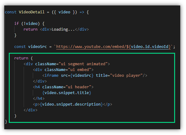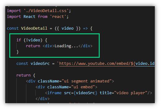 ใน VideoDetail.js เรารับค่า video มา มีการตรวจสอบว่า ถ้าไม่มีค่า (null) ก็จะแสดงคำว่า Loading… แทน